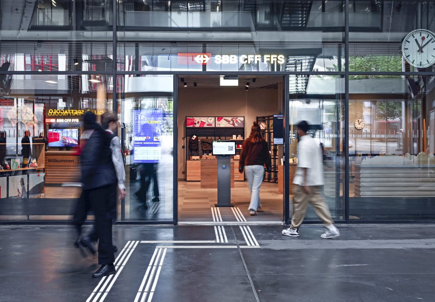 Die Umsetzung erfolgt innerhalb der bestehenden Räumlichkeiten, ohne Eingriffe in die Gebäudehülle. Während der rund zehnmonatigen Bauphase wird ein zweigeschossiges Provisorium mit sieben Schaltern und Büroräumen bereitgestellt. Der Zugang für Mitarbeitende wird über einen neuen, barrierefreien Eingang nördlich des Treppenhauses gewährleistet. Technisch wird die Heizungs-, Lüftungs- und Klimaanlage den neuen Anforderungen angepasst, während bestehende Systeme weitgehend beibehalten werden. Die Gestaltung der Oberflächen folgt den Vorgaben des SBB-Handbuchs für Reisezentren und schafft eine zeitgemässe, einladende Atmosphäre.